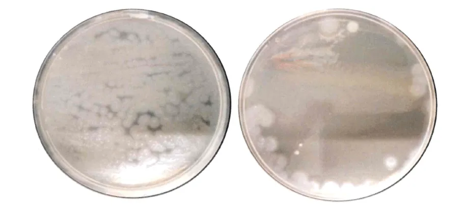 On the left: the devastating attack of Pseudomonas aeruginosa — a full-blown bacterial explosion covering every millimeter of the petri dish.